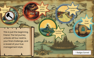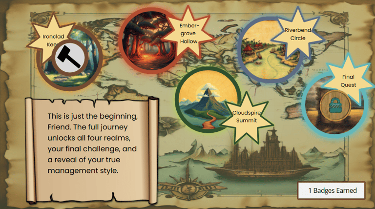 Unlocking Insights: Upon earning all four badges, learners unlock the final quest, which features a quiz designed to reveal their management style. This section includes valuable printable resources that provide insights into their style and tips for improvement, encouraging personal growth.