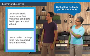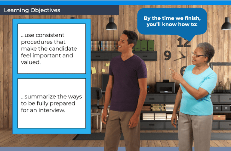 This 30 minute asynchronous eLearning course is designed to provide hiring managers and HR interviewers with consistent interview strategies that will help them find and hire more qualified candidates. The current interviewing process is not providing successful candidates for the company, so a more consistent, company-wide procedure is being implemented.