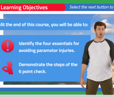 I created this 45 minute asynchronous eLearning course for students interested in learning to pilot a paramotor. Before a paramotor student begins in-field training, it is imperative that they are aware of the safety essentials and safety checks they must have and perform before they can fly.